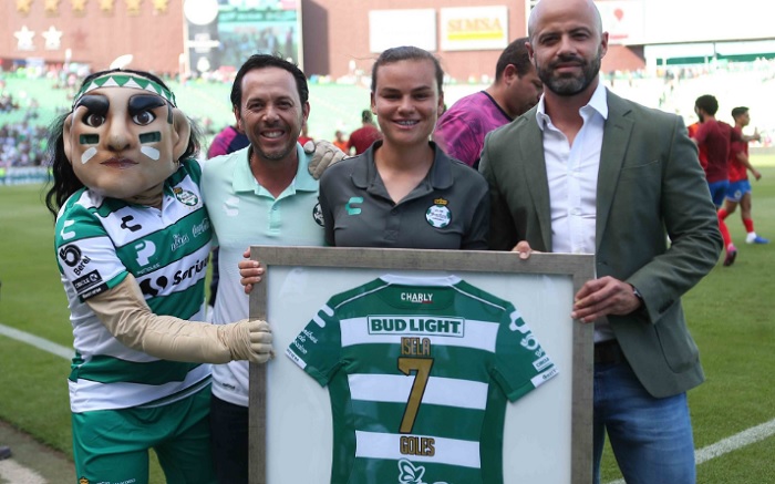 Previo al duelo de @ClubSantos ante @Chivas, nuestra #Guerrera Isela Ojeda fue reconocida por el campeonato de goleo logrado en el pasado Clausura 2019. ¡Gran trabajo! 💪#ModoGuerrero pic.twitter.com/3Ovdt9S8ZP