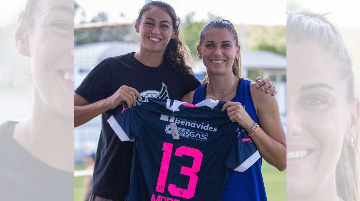 Christina Burkenroad, futbolista de Rayadas, le regaló una camiseta del Monterrey a la leyenda estadounidense Alex Morgan, quien recibió su obsequio con una gran sonrisa.
