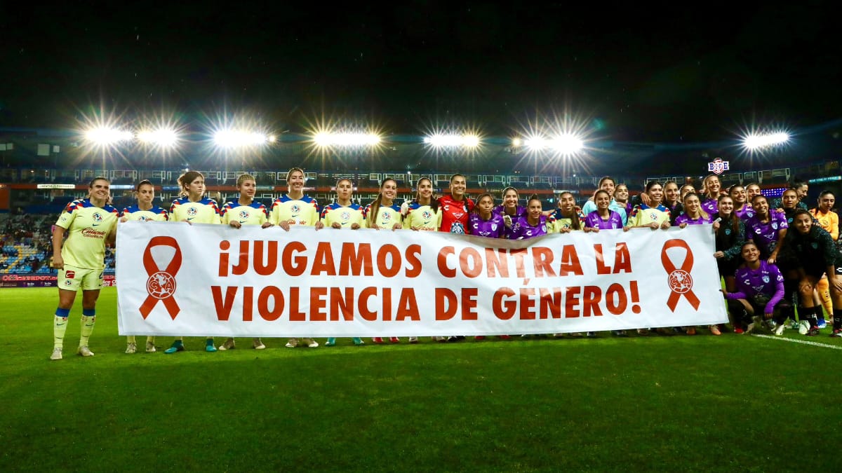 Antes del cotejo, todas las jugadoras de ambos equipos se unieron en la media cancha para mostrar una manta con la siguiente leyenda: “Jugamos contra la violencia de género”.