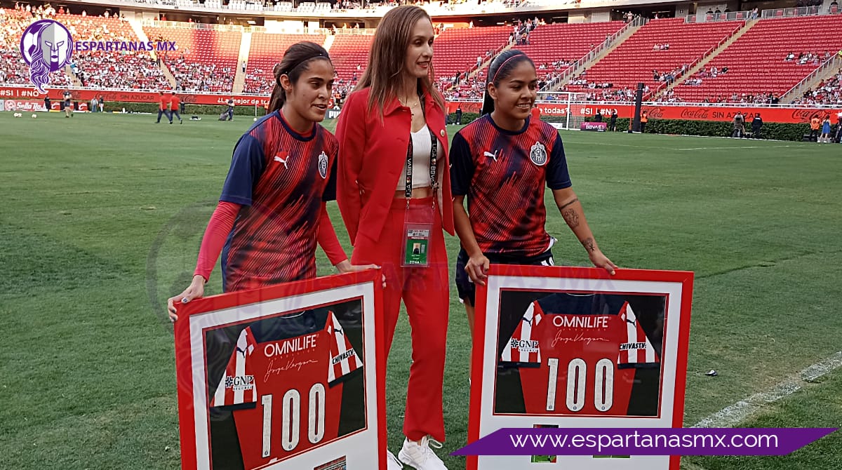 Minutos antes de que arrancara el partido, ambas futbolistas fueron homenajeadas por Nelly Simón, directora deportiva del cuadro tapatío.