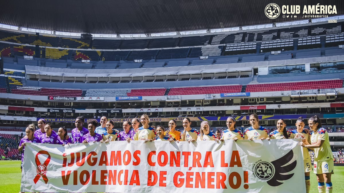 Tan concentrada se mostró, que no se percató que debía tomarse una foto muy importante con sus compañeras y las futbolistas del América, pues todas, juntas, mostraron una manta con la leyenda ‘Jugamos Contra la Violencia de Género’.